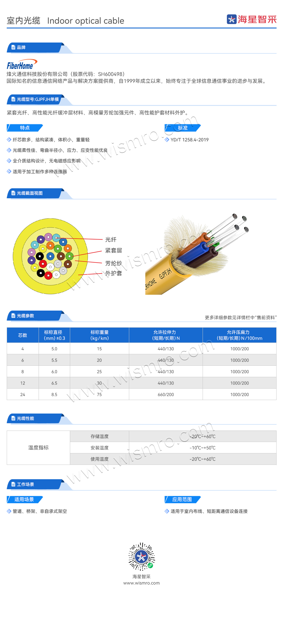 烽火(FiberHome)GJPFJH-8B1.3 室内单模8芯束状光缆