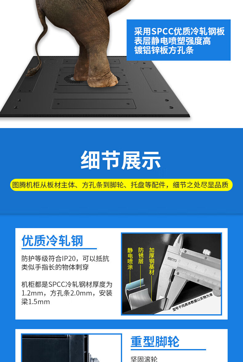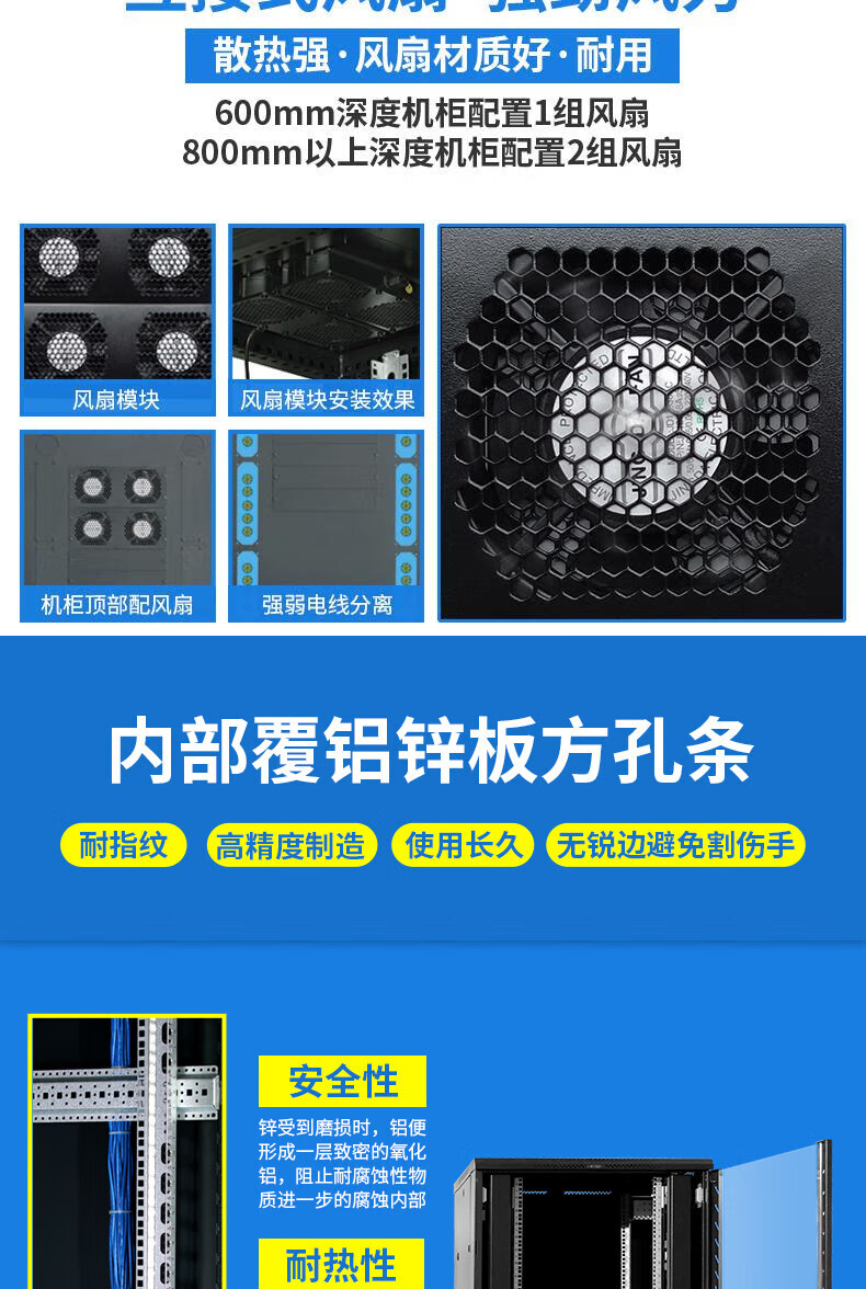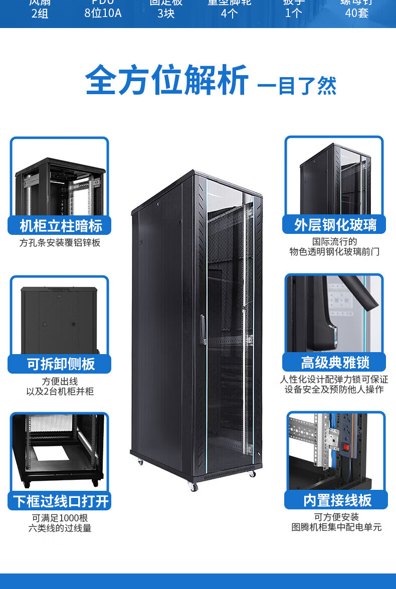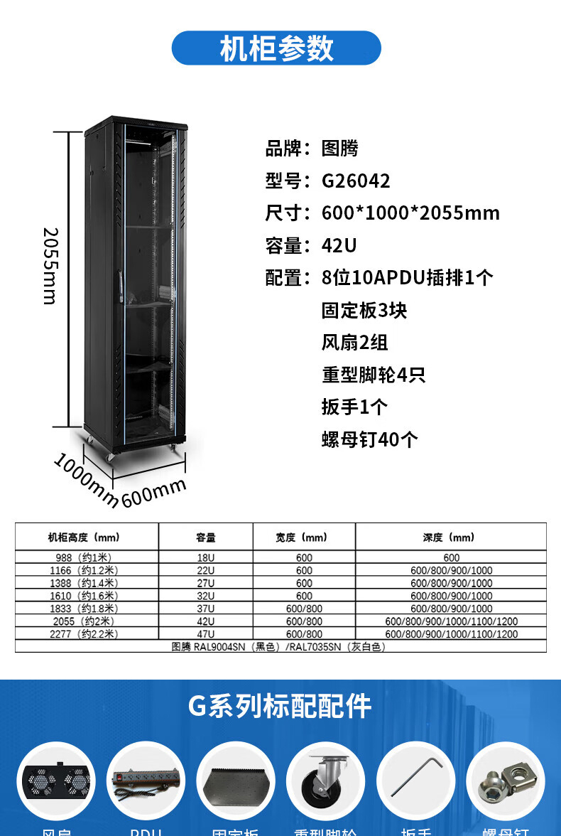 8位10A电源PDU1套,固定板3块,风扇部件2组,4只两寸重型脚轮,M6方螺母钉40套,内六角扳手一只。