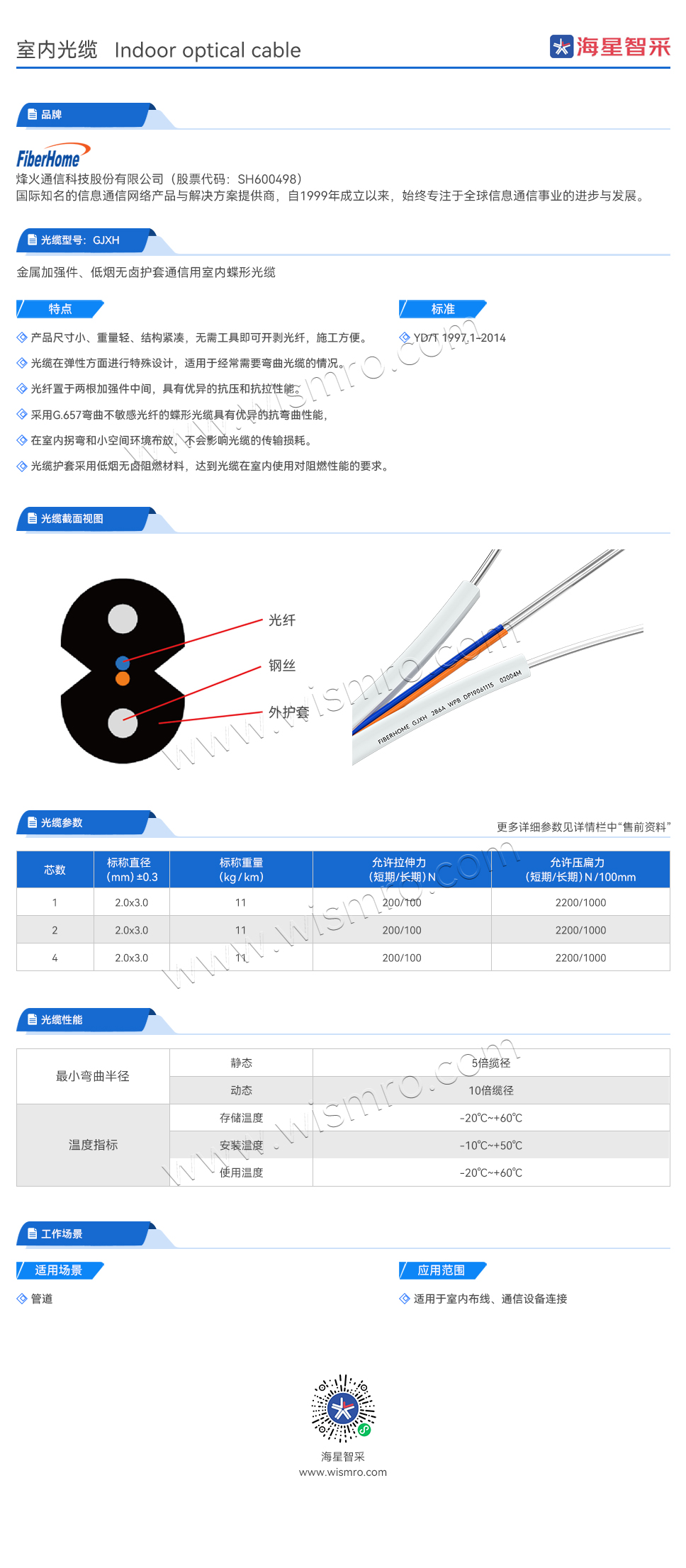 烽火(FiberHome)GJXH-1B6a 室内金属蝶形光缆 1芯2钢丝