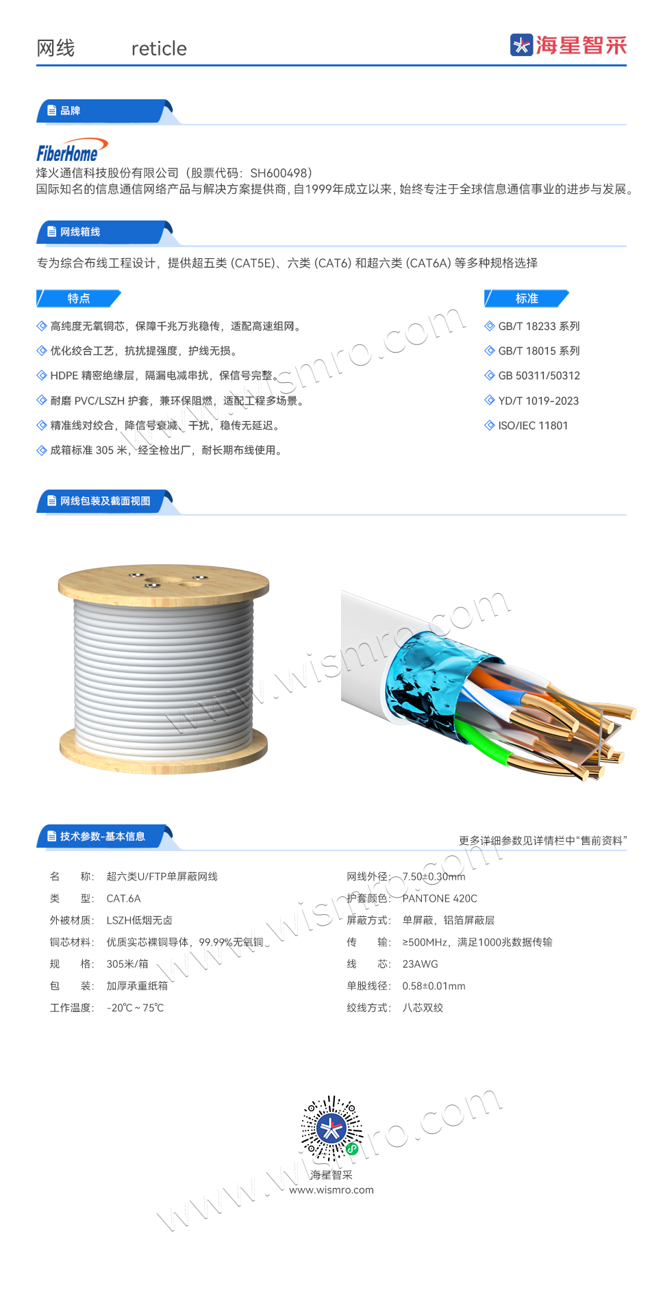 烽火(FiberHome)Cat.6A超六类U/FTP单屏蔽网线 305米/箱
