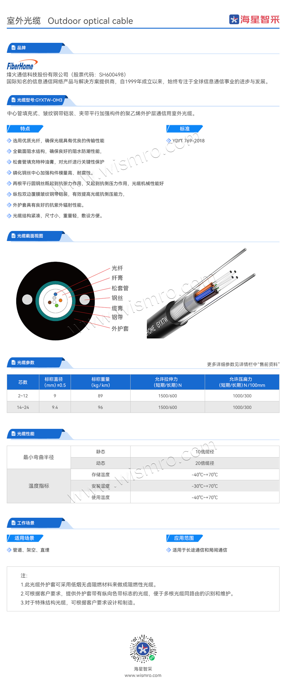 烽火(FiberHome)GYXTW-4A1a 4芯OM3室外万兆多模铠装中心管式光缆