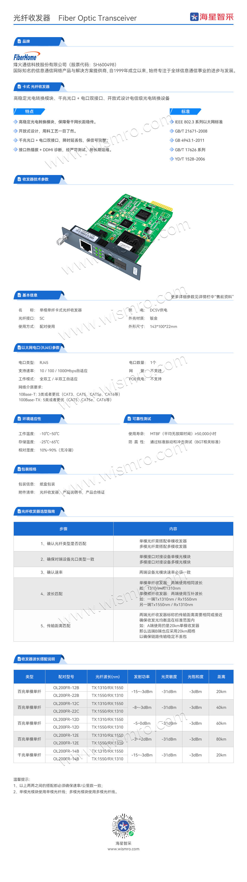 烽火(FiberHome)单纤1光1电电信级插卡式收发器-SC光口