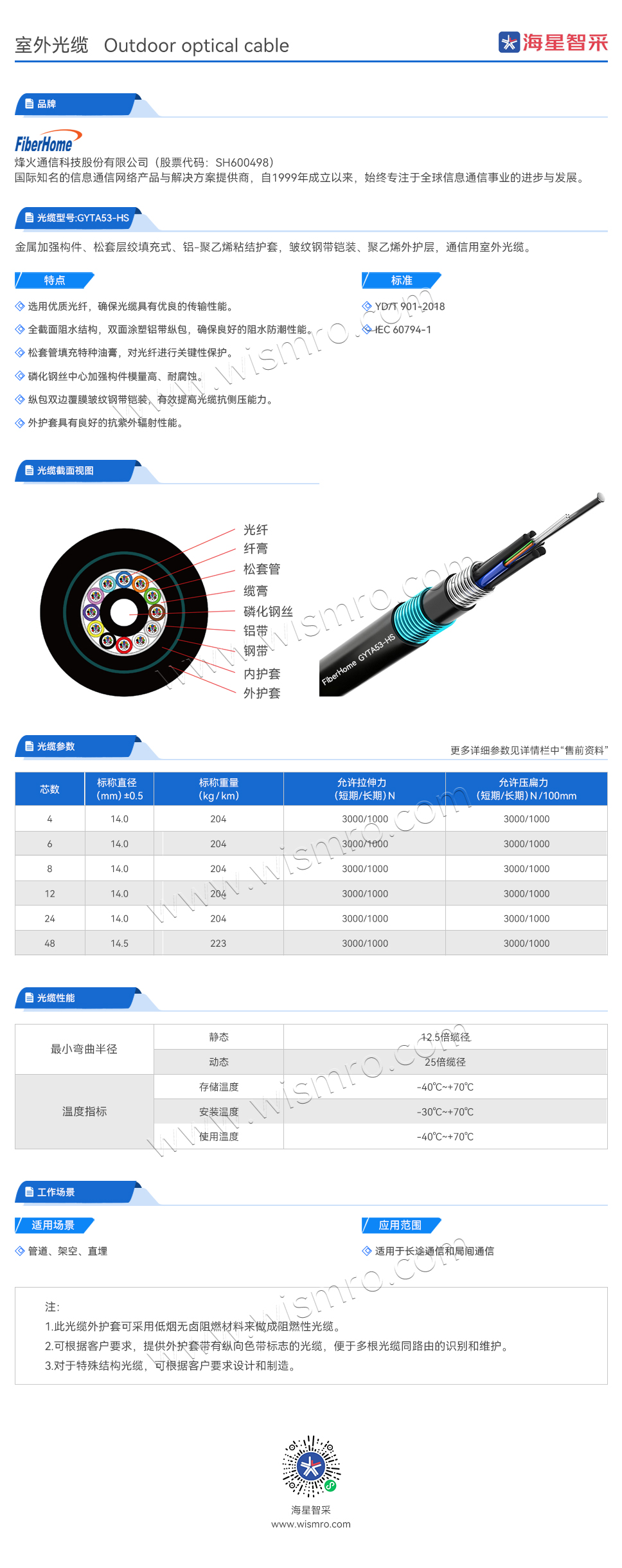 烽火(FiberHome)GYTA53-48B1.3-HS 48芯增强型室外单模铝带层绞式重铠光缆